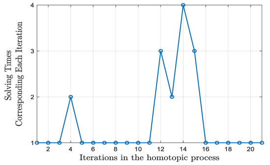 Figure 8 and Figure 9 illustrate the variation in the step size with respect to and the number of solving times necessary for a successful resolution of each auxiliary problem, respectively. During iterations 11 to 16, i.e., when falls within the range of [0.02, 0.09], the resolution fails many times and the decreases to a relatively small degree. If only can be reduced, this is likely to result in a situation where is too small, thus hindering the progression of the homotopic process. In our algorithm, increases after each successful resolution, as depicted in Figure 8. This approach not only mitigates the difficulty of a stagnant homotopic process but also improves the speed of homotopic iterations, thereby enhancing the efficiency of problem-solving.