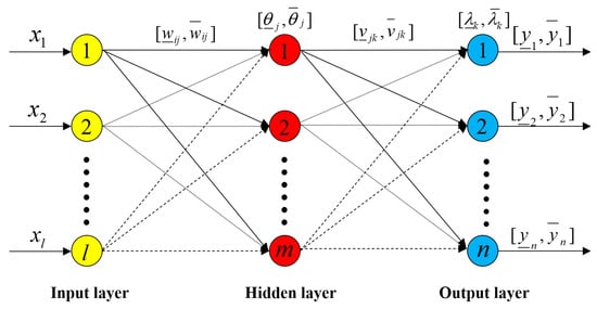 In this setting, and represent the upper and lower bounds of the interval parameter, respectively. The output corresponding to the hidden layer is denoted as . The upper and lower bounds of its hidden layer output are , respectively, as Equation (4).