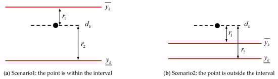 However, modifying the traditional neural network loss function into an interval form and directly applying it to INN is still inappropriate. The loss function based on IMSE does not reflect the characteristics of the interval-enveloped target values, as illustrated in Figure 4. In this figure, the upper bound of the load identification interval is at a distance of from the real load sample , while the lower bound is at a distance of from . In two different interval scenarios, both and are consistent, resulting in identical IMSE function values. However, the coverage of the intervals differs significantly. Clearly, scenario 1 is more desirable.