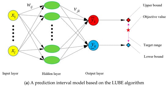 The fundamental concept of INN involves generating interval output results through neural networks. For interval prediction, algorithms like the LUBE (Lower Upper Bound Estimation) algorithm [] construct a neural network model with dual output neurons. In this model, the two outputs of the neural network represent the upper and lower bounds of the prediction interval, thereby forming the output interval. The INN model proposed in this chapter achieves interval results by utilizing interval weights and thresholds within the network. Figure 6 illustrates the distinctions between these two methods. Compared to the LUBE algorithm, the INN architecture used in this study offers greater fitting flexibility due to the interval form of weights and thresholds, even with the same number of layers and neurons.