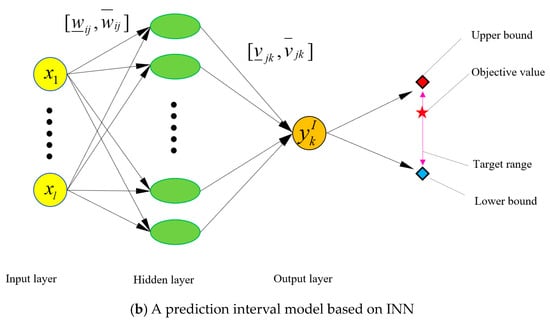 Traditional neural network methods can accurately establish a mapping bridge between structural responses and real loads, and while the mapping accuracy may be high, it is not credible when faced with data that deviate from true values. Due to the point-to-point input–output mapping in traditional neural network architectures, slight variations in the structure itself or minor disturbances in measurements can cause significant deviations in the performance of a well-trained traditional neural network, potentially rendering it completely ineffective. Dispersed data might all be correct but not entirely accurate. The fixed architecture of traditional neural networks can become confusing and ineffective when faced with the variability of a population of structures, as it struggles to adequately respond to and represent such diversity. In such cases, INNs [,,,] can effectively solve the modeling problem of uncertain data. INNs, based on the combination of interval analysis and traditional point-value neural networks, use interval numbers to characterize subjective and objective uncertainties, use traditional point-value neural networks to complete physical process modeling, and achieve the modeling and quantification of imprecise data in a clever combination. By using new modeling methods such as an INN in system design, it is possible to effectively avoid model structural errors and other requirements. Some scholars [,] have studied interval prediction models for neural network prediction, but the existing studies are all based on point-value neural networks to achieve interval value prediction, which is essentially still a statistical regression. Point-value neural network-based interval prediction is difficult to provide a comprehensible explanation during training, and the uncertainty of system inputs and parameters is difficult or unable to be quantified. INNs are a generalization of interval prediction models and can provide a comprehensive prediction result, not just a point value. In 1991, Ishibuchi and others [] proposed the backpropagation neural network (BPNN) model with interval input and point-value network parameters for the first time. They also provided forward calculation and backward learning algorithms based on interval analysis theory. Since then, INNs have begun to enter the academic research field. In 1998, Beheshti [] et al. defined the concept of INN for the first time and divided the training problem of INNs into two categories: directly obtaining numerical solutions and solving nonlinear optimization problems. In 2000, Garczarczyk [] proposed the gradient descent algorithm for the 4-layer INN with interval weights and thresholds. Yao [] proposed an improved INN based on the Widrow–Hoff learning rule in 2004 and combined it with the time-delay neural network to construct a dynamic INN model. In 2009, Campi, Calafiore, and Garatti et al. [] developed an interval prediction model for supervised learning, which can perform interval predictions with guaranteed accuracy. In 2019, Sadeghi et al. [] proposed a neural network backpropagation algorithm with interval predictions, which uses a small batch of random gradient descent algorithms to train and quantify the uncertainty of the neural network, thereby achieving constant-width interval predictions. In 2022, Saeed [] proposed two new interval prediction frameworks using independent recurrent neural networks. This method employs Gaussian functions centered around the predictions of point forecast models and the estimation errors of error forecast models to estimate the prediction intervals. The average coverage width index improved by 43% and 12%, respectively, compared to traditional models and models based on Long Short-Term Memory (LSTM). Shao [] introduced a new approach to obtain reliable predictions from the perspective of pattern classification. A novel hybrid framework was established, composed of nested LSTM, Multi-Head Self-Attention (MHSA) mechanisms, CNNs, and a feature space identification method, aimed at robust interval forecasting.