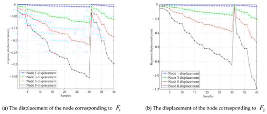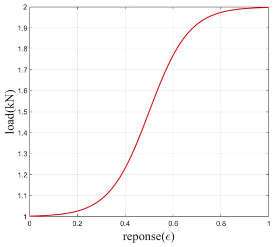 Assuming the structure bears a load denoted as and generates a response , when there is a single measurement point, the response corresponds directly to the load and can be represented as a function of , such as . The unit of is kilonewtons (kN) and represents the structural strain. Similarly, from the perspective of identifying the inverse problem, the load can also be expressed as a function of the response , . In the example, the form of is assumed as shown in Equation (12).