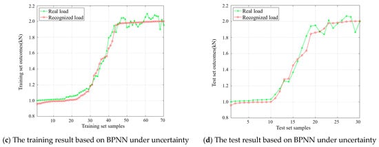 The training process of network parameters and the fitness function are illustrated in Figure 9. To illustrate the necessity of interval neural networks, a deterministic neural network as Figure 10 was established for comparative validation. From Figure 10a,b, if the uncertainties within the structural group are not considered, the recognition results of the traditional neural network can fit well both in the training and testing sets. However, as can be seen in Figure 10c,d, traditional neural networks fail to quantify biases in the face of uncertain disturbances. When applying the trained neural network for load identification, a deterministic neural network provides a fixed load result. This means that while we can only infer that the real load is near the identified value—whether it is slightly higher or lower, and by how much—these details cannot be predicted in advance. Consequently, in practical engineering applications, researchers find it very challenging and lack confidence in making decisions based on such fixed-load results. In addition, a well-trained deterministic network structure may become inapplicable or even completely fail with slight changes in the data model. Situations where the identified load is less than the real load are extremely dangerous in engineering applications.