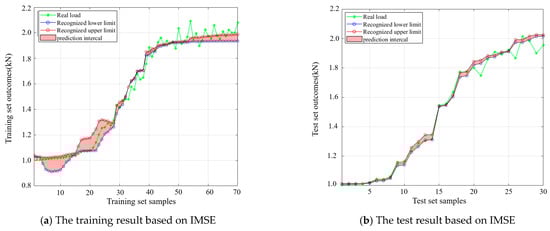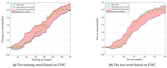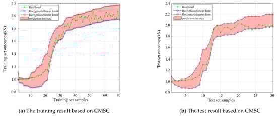 Furthermore, to validate the performance of interval neural network load identification under different loss functions, the study conducted a comparative analysis. It can be observed in Figure 11 that while the identification accuracy based on IMSE is relatively high, the intervals do not encompass the sample points, rendering the identified intervals non-referential. Conversely, the intervals identified based on CWC are sufficiently wide to cover the real load samples as Figure 12. However, the CWC loss function only imposes constraints on interval coverage and width while neglecting the correspondence between interval medians and the real load. As a result, it significantly loses the mapping relationship between response and load functions, as compared to Figure 8. In contrast, the intervals identified using CMSC in Figure 13 not only ensure full coverage of the training loads but also better reflect the functional mapping between response and load. In the test set, only one sample is not covered by the identified interval, demonstrating a more effective and practical interval estimation. At this point, the values for the test set parameters are as follows: PICP = 96.67%, IMSE = 0.0072, and CMSC = 0.0079.