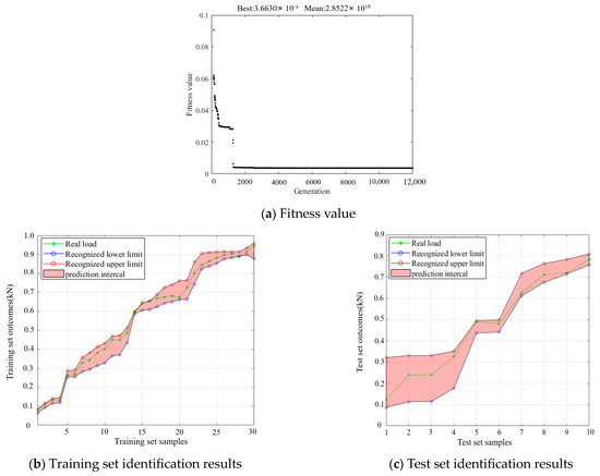 As shown in Figure 19b,c, the stiffened plate was loaded at the lower end and fixed at the upper end. There are three structural measurement points; thus, the neural network has three input neurons and one output neuron. After testing, a three-layer hidden layer with four neurons yielded satisfactory recognition results. In addition, the genetic algorithm was configured with a population size of 50, a maximum iteration number of 20,000, a credibility level of 95% in the CMSC function, and an amplification factor of 50.