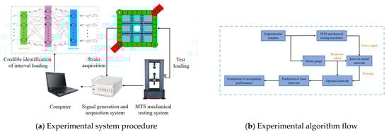 Specifically, the equipment includes an MTS mechanical testing machine, a resistance strain gauge rosette, and a data acquisition system. The MTS mechanical testing machine is used to apply loads to the test specimen, primarily through a stepwise loading process. The strain gauges measure the structural strain, capturing local response information of the structure under load. To establish the load identification experimental system, it is crucial to define the transmission paths of both the load and response signals and subsequently develop the experimental procedure. Initially, the loading scheme is set up using an MTS mechanical testing machine to apply the load to the test piece and simultaneously collect load information. Additionally, strain gauges are used to measure the response signals during the process and input them into the load identification algorithms for comparison with the collected real load information. The detailed process is illustrated in Figure 18.