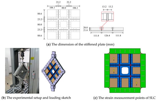 The reinforced pieces are made of aluminum alloy, while other parts are made of fabric composite materials. The size of the stiffened plate is shown in Figure 19a. The stacking order of all composite material parts is . The test setup and loading schematic diagram of the shear loading condition (SLC) are shown in Figure 19b. In the load diagram of SLC, the tensile force is transmitted to the fixture through a planar hinge, causing the structure to be subjected to shear load.