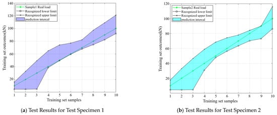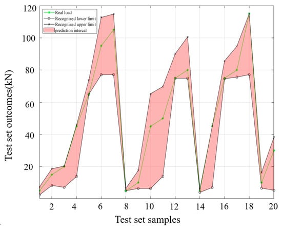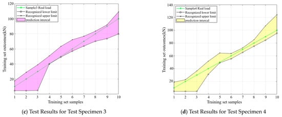 The recognition effectiveness of the training dataset loadings is illustrated in Figure 20. It can be observed that the PICP is 100%, indicating that the identified interval can effectively envelop the real loadings. The CMSC index is 0.04, demonstrating that the recognition results adequately balance interval coverage and interval width. The optimally trained INN was applied to predict four additional operating conditions for the test specimens, all yielding excellent load-interval recognition results, as in Figure 21 and Table 5.