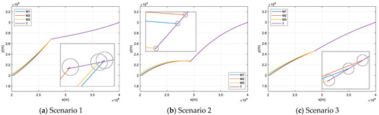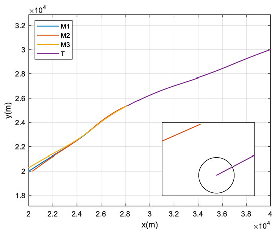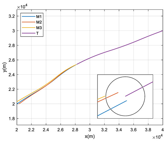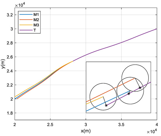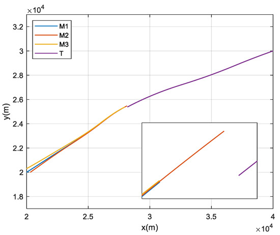 Furthermore, for the problem of multi-missile cooperative interception, inter-missile collisions will cause the loss of operational power, which affects the success rate of interception, so it is necessary to consider collision avoidance when designing cooperative interception guidance laws based on differential games. The collision avoidance methods are mainly divided into three categories. The first one is to carry out path planning as shown in [32,33] to find the feasible path to reach the target point under the collision-free condition. However, its real-time property is poor because the path planning algorithms are generally computationally complex and cannot respond to the environmental changes quickly. The second such as [34,35,36,37] is to detect collisions during the guidance process, and take evasive measures when possible collisions are detected. Since the evasive measures are carried out after the detection, their effectiveness cannot be guaranteed, and they may cause guidance deviations. The third category as shown in [38,39,40,41,42] is to directly design guidance laws considering the collision avoidance, which simultaneously meets the requirements of algorithmic real-time property and guidance accuracy. Inspired by [42], this paper avoids inter-missile collisions by introducing an inter-missile distance constraint as the interior point constraint of optimal control.