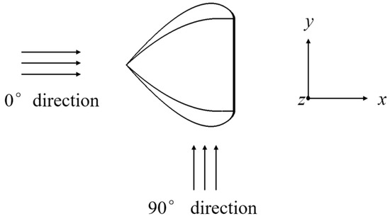 The terms “HH polarisation” and “VV polarisation” are used to describe the direction of the electric field. HH polarisation is defined as a horizontal electric field, while VV polarisation is defined as a perpendicular electric field to the horizontal plane. The azimuth angle of the electromagnetic wave is defined as 0° when it is illuminated from within the horizontal plane along the x-direction and 90° when it is illuminated from the y-direction. This is illustrated in Figure 3. Furthermore, the 0° direction of the model should be defined as the front, the 90° direction as the side, and the 180° direction as the back.