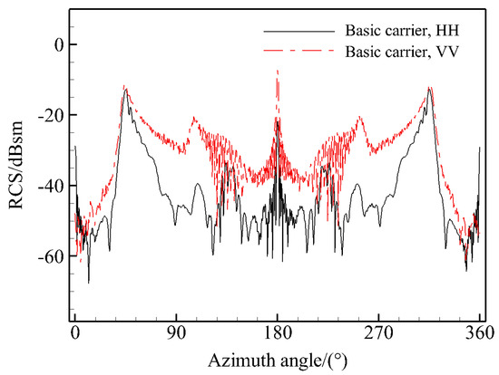 From the RCS curves in Figure 4, it can be observed that the scattering peaks of the basic carrier in the VV polarisation are predominantly edge-winding from the side prisms and specular reflection from the trailing edge end face; in the HH polarisation, the scattering contribution is primarily from the side prisms. The mean RCS values presented in Table 1 demonstrate that the basic carrier exhibits a low scattering magnitude across all frequency bands. Furthermore, the scattering of the carrier itself is observed to be at a low level in both the front and back angular domains of interest. This provides a useful benchmark platform for the comparison and evaluation of the scattering characteristics of various carrier models.