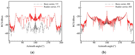 Comparison of RCS curves of the rudder carrier and basic carrier: (a) VV, 9 GHz; (b) HH, 9 GHz.