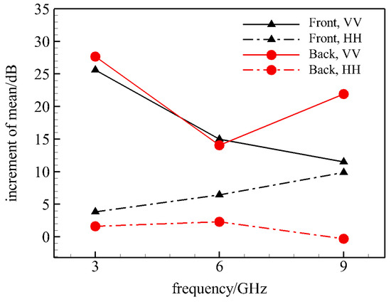 Figure 8 illustrates the RCS mean increment of the CC-wing carrier and the rudder carrier in comparison to the basic carrier. It can be observed that in HH polarisation, the scattering contribution from the jet nozzle and surface in the front direction is less than that from the rudder gap, while that in the back direction is greater than that from the rudder gap. Furthermore, with the increase in frequency, the difference in the scattering increment is observed in the front RCS mean, and a reduction in the CC-wing can reach 9.94 dB at high frequency. In VV polarisation, the front RCS mean increment of the CC-wing is consistently lower than that of the rudder at all frequencies. However, the difference in the RCS mean increment between the two decreases with the increase in frequency and only increases by 3.94 dB at high frequencies. Meanwhile, the substantial alteration in the profile of the wing trailing edge resulting from the circulation control technique has led to a notable divergence in the characteristics of the two models in terms of the change in the back RCS level in response to the frequency of the incident radar wave.