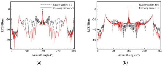 Comparison of RCS curves of CC-wing carrier and rudder carrier: (a) VV, 9 GHz; (b) HH, 9 GHz.