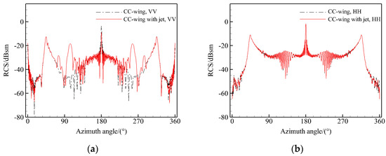 In the operational state of the circulation control system, the jet nozzle is open, allowing electromagnetic waves to enter the cavity structure within the nozzle. A comparison of the RCS curves of the two states of the CC-wing in Figure 9 reveals that the presence of the jet nozzle cavity primarily affects the scattering characteristics at VV polarisation. This is evidenced by the presence of a large RCS wave peak in the side direction, which affects the angular domain, and a clear oscillation of the RCS curves in the backward direction.