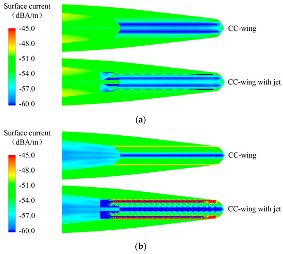 Upon analysis in conjunction with the surface current distribution, it can be seen that the presence of the jet cavity significantly alters the electromagnetic scattering characteristics of the wing tail. A comparison of the tail current distribution at an azimuth angle of 0° (Figure 10a) reveals that the cavity strengthens the surface currents on the outer wall surface of the nozzle and the Coanda surface. Figure 10b,c correspond to the two peak positions in the side direction, where the creeping wave truncation effect on the outer wall surface of the nozzle is stronger and the currents are more concentrated at an azimuthal angle of 75°. Whereas at an azimuthal angle of 105°, the electromagnetic wave can directly illuminate part of the inner wall of the cavity, leading to further enhancement of the surface currents on the Coanda surface, which results in a significant enhancement of its RCS level. Table 2 also demonstrates that the mean RCS values in the front and side directions exhibit an increase with the rise in incident electromagnetic wave frequency. The enhancement of the scattering levels in the front and back directions brought by the cavity is more significant at high frequencies, and the enhancement of the mean RCS value in the side direction can reach up to 10.83 dB at high frequencies. When electromagnetic waves are incident in the backward direction, as illustrated in Figure 10d, more waves can enter the cavity structure and undergo multiple reflections inside the cavity before returning. This leads to an obvious oscillation on the radar cross-section (RCS) curve near the azimuthal angle of 180°. It is important to note that, due to the slanted surface of the jet nozzle designed in this study, a portion of the electromagnetic wave enters the cavity and is no longer returned along the original path after multiple reflections. This results in the mean value of its back RCS decreases by 4.42 dB. This effect is gradually weakened with the decrease in the frequency of the incidence of the electromagnetic wave.