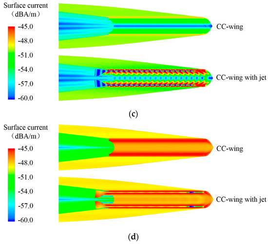 Surface current distribution in the vicinity of the trailing edge of CC-wings for inoperative/operational states: (a) VV, 9 GHz, azimuth = 0°; (b) VV, 9 GHz, azimuth = 75°; (c) VV, 9 GHz, azimuth = 105°; (d) VV, 9 GHz, azimuth = 180°.