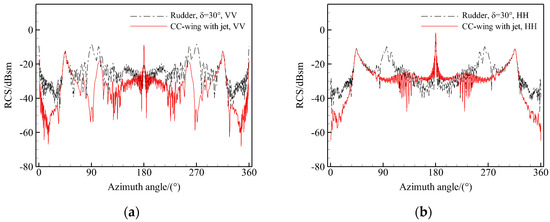 Comparison of RCS curves of CC-wing carrier with jet and rudder carrier with 30° of deflection: (a) VV, 9 GHz; (b) HH, 9 GHz.