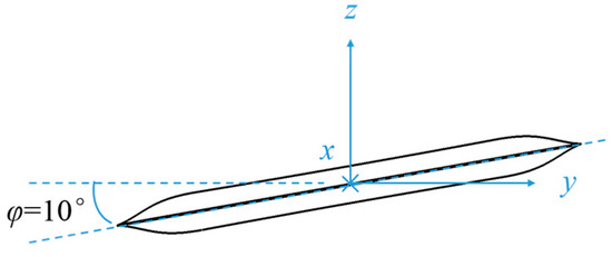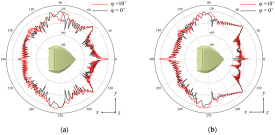 Furthermore, the variation in scattering situations at a roll angle of 10° is comparatively analysed, and the roll angle of the airfoil is schematically illustrated in Figure 13. From an examination of the variation of the curves in Figure 14 and Figure 15, it can be observed that both the mechanical rudder and the CC-wing demonstrate a reduced impact on the back RCS as a result of changes in roll angle. However, both exhibit an elevated front horizontally polarised RCS level. The optimisation of the stealth performance of the trailing edge structure by the circulation control technique is readily constrained when the aircraft undergoes a roll operation.