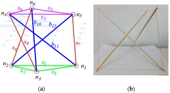 If the tensegrity structure is a planar structure, the rank of the force density matrix is . It can be seen that , , and . Substituting into Equation (29), we obtain , , and . It can be seen from Equation (31) that