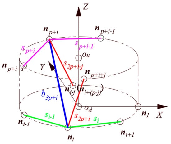 When applying the force density method to determine form, it is assumed that the geometric topological form (connection matrix) of the structure is known. If the number of bar members of the unit is denoted as , which is defined as the main fractal parameter, then the total number of nodes can be calculated (). The lower-end surface node is represented by , ; the upper-end surface node is represented by , , and cable members. The total number of members in the structure can then be determined ().