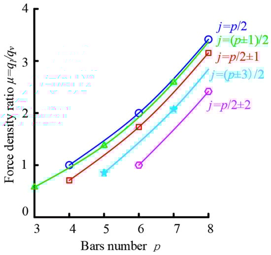 It can be seen from the table that the stable configuration of the system exhibits different force density ratios depending on the number of bars. When there are three bars, there is only one force density ratio. With four bars, there are two force density ratios, and when , the force density ratio equals one. For five bars, there are two force density ratios. In the case of six bars, there are three force density ratios; when , the force density ratio equals two; when , the force density ratio is one.