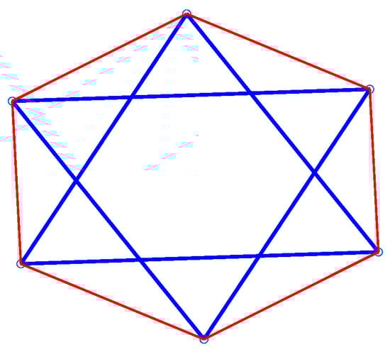 For the six-bar configuration with an auxiliary fractal parameter of one, the force density matrix is determined based on the overall force density attribute of equal cable length tensegrity in Section 3.3. The value of is determined following the method outlined in the article, and it consistently results in , indicating that when in the six-bar configuration, only one planar structure with equal cable length can be formed. This aligns with the data in Table 1 and supports the conclusion in the literature [] that when and , . Figure 6 illustrates the configuration based on the conclusion data from the literature [], showing the physical layout when the main and auxiliary fractal parameters are and , respectively. The model proposed in this paper is in line with this physical configuration.