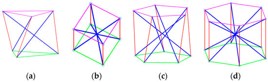 Spatial structure model of tensegrity with equal cable length: (a) three-bar model; (b) four-bar model; (c) five-bar model; (d) six-bar model.