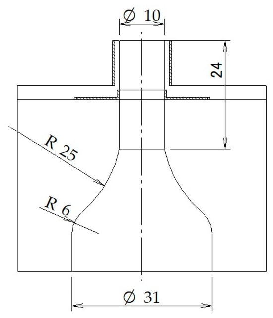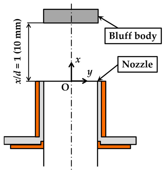 Figure 5 shows the disk-type bluff body installed at the upper part of the nozzle exit. The bluff body was disk-shaped with an outer diameter of 10 mm and a thickness of 2 mm. The device included a pillar with a width of 1 mm to be installed at the top of the nozzle.
