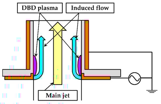 In addition to the simple structure shown in Figure 1, DBD-PA configurations include structures in which multiple DBD-PAs are placed to generate induced flow at low voltage and structures in which the DBD-PA electrodes are arranged in three layers, with a negative DC voltage applied to one of the electrodes to control the direction of the induced flow [21,22].