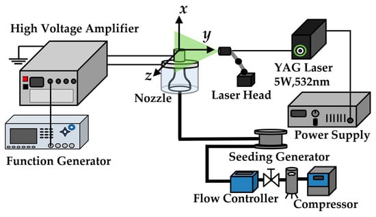 Figure 6 depicts a schematic of the experimental setup. Air was supplied from a compressor, the flow rate was adjusted using a mass flow controller, and the air was passed through a straightening tube with an inner diameter of 31 mm and length of approximately 0.85 m, to straighten the flow. Then, the converging nozzle with the DBD-PA nozzle attached at the tip (Figure 3) ejected the jet vertically upward. The main flow direction of the jet was defined as the x-axis, the nozzle radius direction as the y-axis, and the direction perpendicular to them as the z-axis. The DBD-PA was driven by outputting the signal of the voltage waveform applied to the DBD-PA from a function generator, amplifying the voltage with a large high-voltage power supply, and applying it to the DBD-PA. The jet cross-section was visualized by mixing tracer particles of DEHS (di-ethylhexyl sebacate) oil ejected by a seeding generator into the jet, illuminating them using an Nd:YAG laser using the laser light sheet method, and photographing them using a high-speed camera. Here, the particle size of the tracer particles was approximately 1 μm [23]. As shown in Figure 7, the bluff body was installed parallel to the nozzle at a distance of x/d = 1 from the nozzle exit. The origins of the x, y, and z axes were the center of the nozzle at the nozzle tip.