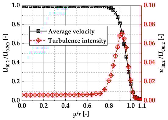 Figure 8 shows the average nozzle exit velocity UI0.2 and the turbulence intensity u’I0.2 distribution at x/d = 0.2 for a free jet (without the bluff body and not driving the DBD-PA). Measurements were taken at 0.2 mm intervals from y/r = 0–0.8 and at 0.1 mm intervals from y/r = 0.8–1.1 by moving a hot-wire anemometer along the y-axis. Here, the measurement time of the hot-wire anemometer was 10 s per measurement point, the data rate was 20 kHz, and U0.2O was the nozzle center velocity at x/d = 0.2. The sensor shape and calibration method of the hot-wire anemometer used in this study are described below. The sensor shape of the hot-wire anemometer was I-type, with a linear tungsten wire of 5 μm diameter and 1 mm length coated with Ni. The heating ratio was set to 1.6. The hot-wire anemometer was calibrated at x/d = 0.5 on the nozzle center axis of the free jet, to measure the velocity using a two-dimensional laser Doppler velocimeter capable of measuring absolute velocity.