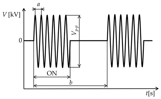 The experiment was conducted at an average jet exit velocity UA = 10 m/s (Re ≈ 6600), which was calculated from the cross-sectional area of the nozzle exit and the jet flow rate. The DBD-PA was burst-driven. Figure 9 shows a schematic of the burst wave applied to the DBD-PA. Here, the driving frequency fdrive and burst frequency fburst were defined by Equations (1) and (2) using the symbols a and b shown in Figure 9.