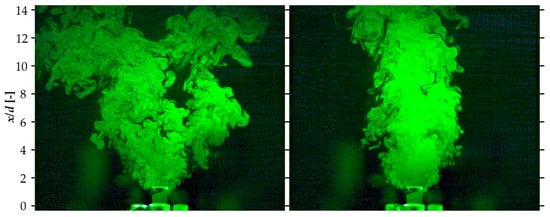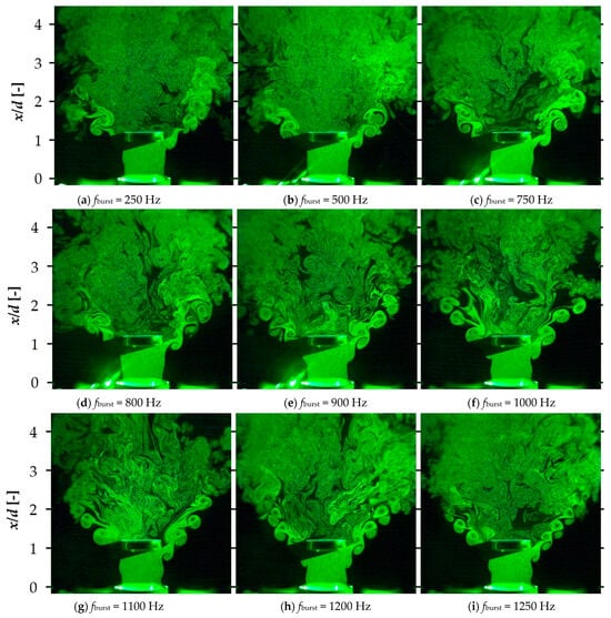 The effects of altering the fburst values of a Dielectric Barrier Discharge Plasma Actuator (DBD-PA) to generate vortices in the jet’s initial stage, which subsequently influenced the jet’s diffusion, were evaluated. The vortex generation frequency fvortex was determined by visualizing the jet cross-section using the laser light sheet method and counting the vortices generated at x/d = 1 near the bluff body installation position in the video. Visualization photography was performed by aligning the laser light sheet so that it could pass through the center of the nozzle and the bluff body, and a high-speed camera was placed parallel to the laser light sheet. Table 1 summarizes the experimental conditions used to determine fvortex, and Figure 10 shows the jet control results at the fburst values given in Table 1. The fdrive was determined to be divisible by the frequency of fburst or to have a decimal point of 0.5 when divided by fburst, so that the AC waveform was not interrupted in the middle.