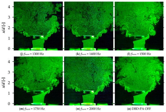 Figure 11 shows that fburst = 900–1400 Hz resulted in fburst = fvortex. At fburst = 900–1400 Hz, a lock-in phenomenon occurred, in which the frequency of the flow excitation induced by the DBD-PA was synchronized with the frequency of the vortices generated on the outer periphery of the jet. Therefore, under lock-in conditions, vortex generation was controlled by the burst frequency, and vortices were generated at regular intervals. Under burst conditions in which lock-in occurred, the frequency of vortices generated by the DBD-PA could be controlled. In our previous studies, we showed that the lock-in phenomenon occurred when a jet without a bluff body was controlled by a DBD-PA [15]. Here, it was clarified that the lock-in phenomenon occurred when the jet with the bluff body was controlled by the DBD-PA.