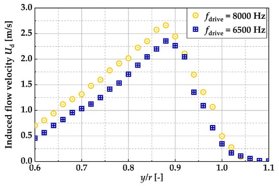 The induced flow velocity varied with the frequency of fdrive: the higher the frequency of fdrive, the higher the induced flow velocity, and the lower the frequency of fdrive, the lower the velocity. On the basis of the experimental conditions shown in Table 1, the induced flow velocity distribution Ud at x/d = 0.2 was measured for fdrive = 8000 Hz, the highest frequency of fdrive, and fdrive = 6500 Hz, the lowest frequency. The results of these measurements are shown in Figure 12. Here, measurements were taken by moving the hot-wire anemometer along the y-axis. The measurement time of the hot-wire anemometer was 10 s per measurement point, the data rate was 20 kHz.