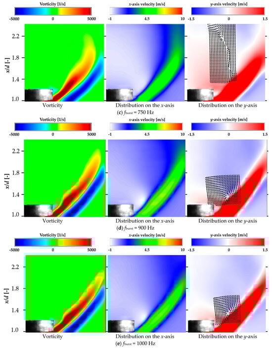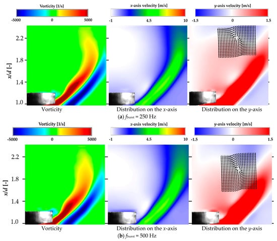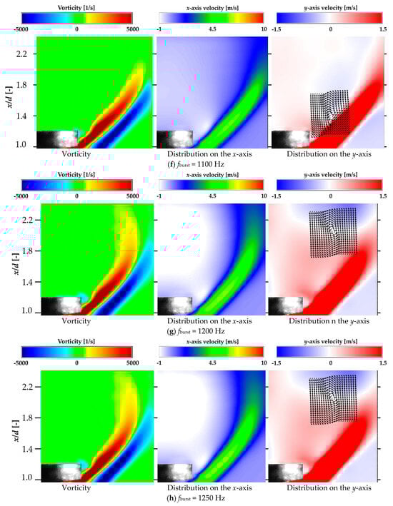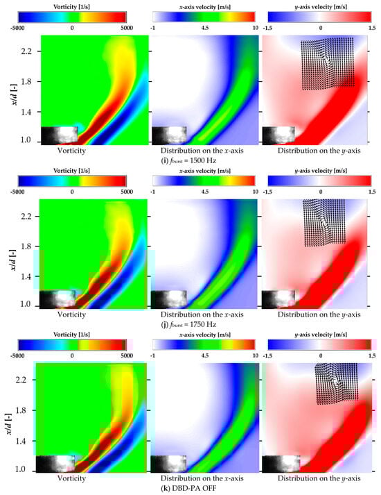 Figure 13 shows that the average vorticity and x-axis velocity distributions at frequencies near fn (fburst = 900–1100 Hz) were spread in the y-axis direction (nozzle radius direction), indicating that the vortices were less likely to be entrained in the recirculation flow. The average vorticity and x-axis velocity distributions on the recirculation flow side for the other DBD-PA driving conditions and with the DBD-PA off were curved along the recirculation flow formed on the downstream side of the bluff body, indicating that the vortices of the jet flow were entrained by the recirculation flow in the direction of narrowing of the jet width. In the y-axis mean velocity distribution, a circulating (rotating) flow was generated from the mean velocity vector in the xy direction at the position where the direction of the velocity on the y-axis changed. For fburst = 900–1100 Hz, the circulating flow occurred at approximately x/d = 1.4, whereas for other conditions, it occurred at approximately x/d = 2.