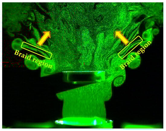 Figure 14 shows that for fburst = 900–1100 Hz, the jet flow in the braid region between the vortices was entrained into the recirculation region at approximately 1.4, thereby forming the recirculation region.