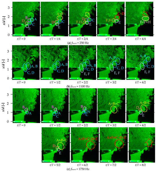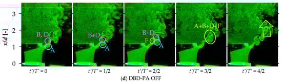 Figure 15 shows the time-series visualization images with the DBD-PA in off mode, fburst = 250, 1100, and 1750 Hz. Here, T is the time of one burst cycle under each DBD-PA driving condition, t is the time with the first visualization image as the reference (zero), T′ is the time of one cycle of fn, and t′ is the time with the first visualization image as the reference (zero). In Figure 15, the vortices generated on the outer periphery of the jet are designated as A, C, and E, and those on the recirculation side are designated as B, D, F, and H.