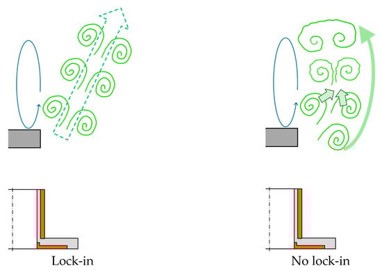 Figure 16 shows a schematic diagram to help comprehend the difference in vortex structure between conditions in which lock-in does and does not occur. Under conditions in which lock-in occurs, the vortices do not merge and reach the downstream and are not entrained in the recirculation flow. Under conditions in which lock-in does not occur, vortices are randomly generated and merge with each other. After merging and collapsing, the vortices diffuse, slowing the flow and becoming entrained in the recirculation flow.