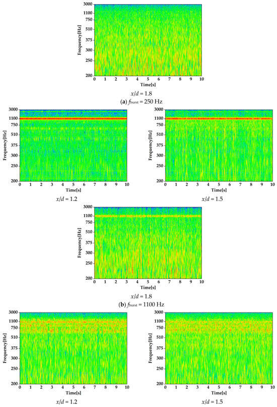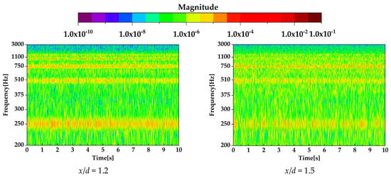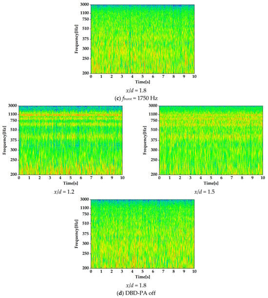 As shown in Figure 18, at x/d = 1.2 and 1.5, the CWT intensity at fburst = 250 and 1100 Hz was strong at the same frequency as the burst frequency. Therefore, vortices were generated under the influence of the induced flow of the DBD-PA. At fburst = 250 Hz, the CWT intensity was also high at harmonic frequencies of 250 Hz.