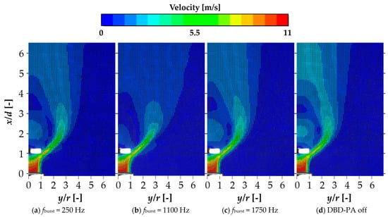 This section clarifies whether differences in jet diffusion occurred at the location where recirculation was generated, depending on the driving frequency of the DBD-PA. Figure 19 shows the visualization results of the jet cross-section up to x/d = 14 obtained by the laser light sheet method, and Figure 20 shows the downstream average velocity distribution obtained by the PIV analysis. The visualization images indicate DBD-PA OFF, fburst = 1100 Hz, and average velocity distributions from the PIV analysis indicate DBD-PA OFF, fburst = 250, 1100, and 1750 Hz. Figure 19 and Figure 20 depict that the downstream jet width at fburst = 1100 Hz was wider than that under other conditions. As shown in Figure 13, at fburst = 900–1100 Hz, the jet width was wider than under the other conditions because the vortices generated by the lock-in phenomenon were less likely to be entrained by the recirculation flow.