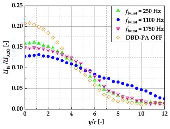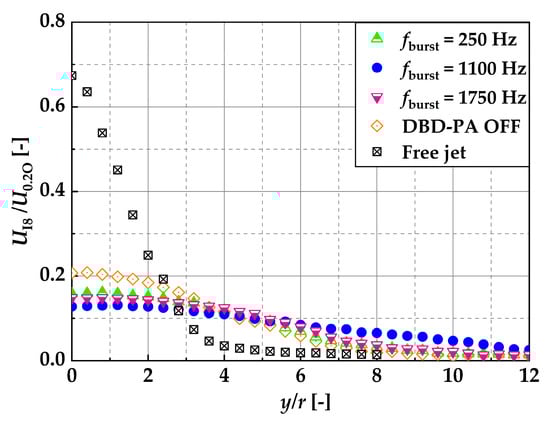 Next, at x/d = 8, downstream of the location where recirculation occurred, the velocity was measured in the radial direction of the nozzle using an I-type hot-wire anemometer, and the average flow rate Qm was further calculated. The reason for using a hot-wire anemometer to determine Qm was that it offered a higher data rate and longer measurement time compared with PIV analysis, thus ensuring higher reliability. The conditions for comparing Qm were DBD-PA off, fburst = 250, 1100, and 1750 Hz, and free jet. Measurements were taken using the I-type hot-wire anemometer. Because x/d = 8 was downstream of the recirculation, the jet advection direction was always considered to be in the positive x-axis direction, and it was assumed that there was no measurement of the velocity in the negative x-axis direction. The measurement points in the y-axis direction (nozzle radial direction) were 30 points at 2 mm intervals, and the measurement positions ranged from y/r = 0 to 12 (0 to 0.06 m), except for the free jet, and from y/r = 0 to 8 (0 to 0.04 m) for the free jet. The free jet measurement point was set to y/r = 8 because the velocity was close to zero at y/r = 8. The data rate at all measurement positions was 20 kHz, and the measurement time at all measurement points was 20 s. Qm was determined using Equation (3), where UI8 is the average velocity at each measurement point, as measured using an I-type hot-wire anemometer: