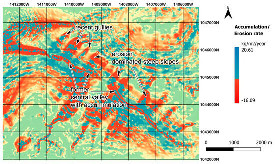 The accumulation (blue) and erosion (red) dominated areas with their values, which are represented in kg/m2/year.
