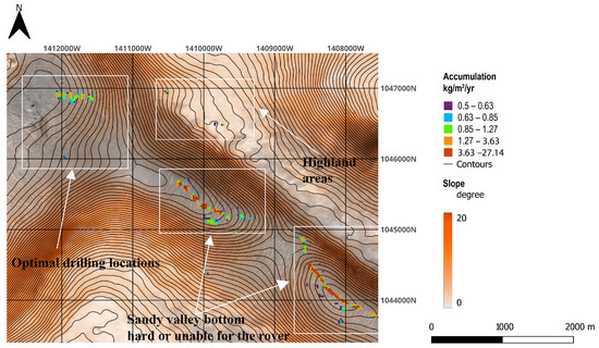 The optimal sampling areas for the rover could be selected using GIS-based methods with a low slope angle and minimal current surface sand occurrence, ensuring convenient and secure access. In the study area, there is a considerable area of sites with accumulated material at or above 0.5 kg/m2/yr; however, it would be too dangerous to reach. Using these constraints, the size of useful areas is significantly reduced (Figure 5).