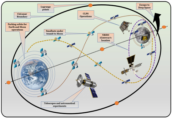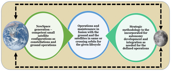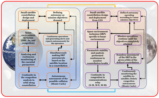 Figure 3 below determines the ethos and the motivation of this proposed approach dedicated to both the Moon and the Earth’s orbits. The essence of the autonomous operations is taken into consideration for the framework, simulations, and analytical results presented in this paper. Hence, sustainability is the major objective behind this designed method.