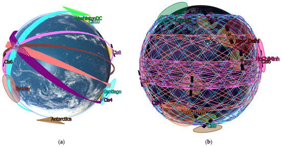 Visual demonstration of the Earth side of the Cislunar space (small satellite constellation) [16]. (a) Flower orientation (VLEO-inertial frame); (b) Flower orientation (VLEO—Body frame); (c) Hybrid orientation (LEO—Walker and Flower); (d) Hybrid orientation (LEO—Body frame); (e) Hybrid orientation (MEO orbits inclusion); (f) Comprehensive orientation (GEO inclusion—body frame).