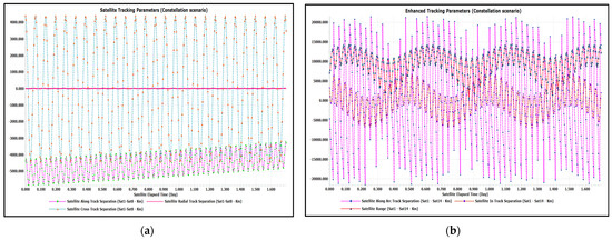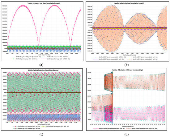 In a similar line of action, Figure 6b gives a full-scale tracking with the Along Arc, In-track, and Range variations that defined the small satellite’s nearest approximate location in the constellation. These variations will be so significant in the real-time operations that they will have ground control in complete trust that the constellation health is secured and in good shape altogether. Figure 6c,d will have the same impact but in a different parametric orientation. The Radial projections offered by Figure 6c will have an impact suggesting the major operation shifts, if any, when the anomalies in orbit show up. In the figure, it shows that there are slight variations from satellite to satellite but under a minor range of deviation. Hence, these changes are considered normal and can be highly varying in the case of unknown and critical anomalies.