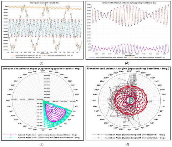 The parametric analysis of Earth’s small satellite constellation (Cislunar) [16]. (a) Along, Cross, and Radial separations Sat-to-Sat (Km); (b) Along Arc Track, In-track, and Range variations (Km); (c) Satellites portraying the Radial projections (Km); (d) RAAN-Azimuth-Elevation variations (Deg.); (e) Azimuth angle variation with aligned satellites; (f) Elevation angle variation with the aligned satellite.