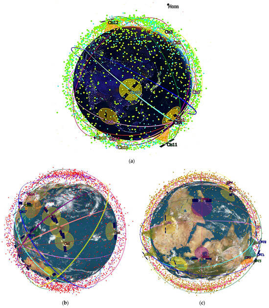 The debris (points) distribution over the constellation (Earth scenario). (a) Tracked debris in the safer zone with mission in progress [16]; (b) Constellation variation under intense debris movement; (c) Mission operations in medium-risk zone of Debris.